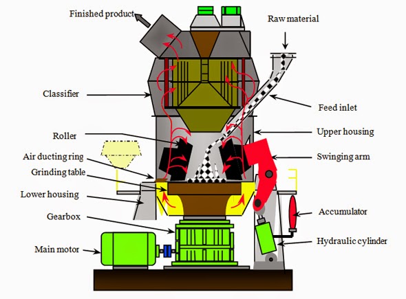 The grinding disc of vertical mill is driving by motor through reducer. The material falls to grinding disc from the feed opening. The materials are driven to the edge of disc by the centrifugal force and crushed into fine powders by rollers. Then, the hot air from the nozzle take the fine powder to high effiency classsifer.The qualified powder are taken by the air to the powder collector to be collected, while the unqualified powder are sent back for regrinding.